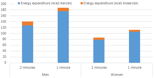 | Figure 1: Aerobic and anaerobic energy expenditure with 2 and 1 minute rest between 30s bouts of battling the rope in the welve men and 10 women (age = 20.8 6 1.3 years) who participanted in Ratamess study (ibid. 2015). |