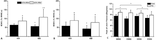 | Figure 3: Changes in vastus lateralis (A), gluteus maximimus (B) EMG activity and knee and hip angles (C) when doing back squats with (KW) or without (NW) knee wraps (Gomes. 2015). |