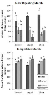 | Both vegetable oils and ghee had identical (beneficial) effects on the starch composition, but they have to be added during boiling or before frying and boiling (Kaur. 2015). |