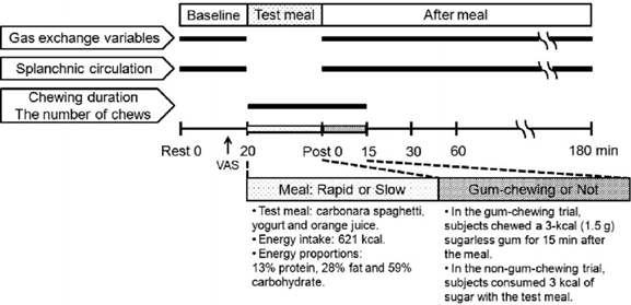 - In each rapid-eating and slow-eating trial, they were instructed to eat the meal at a similar speed in the non-gum-chewing and gum-chewing trials. Gasexchange variables and the splanchnic circulation were recorded until 180 min after the meal (note: I am not going to discuss this data in detail, but if the scientists are right the increase in the amount of blood that's circulating in the organs of the splachnic bed, is more than a correlate of the increase in energy expenditure).