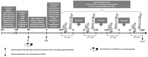 After the 60-minute delay during which the serum caffeine levels rose to peak values (see previous SuppVersity article), they performed a short warm-up and a standardized vertical jump test the scientists describe as follows:"The VJ performance was evaluated by the jump platform System Optical (Cefise®, São Paulo, Brazil). This equipment consists of a laptop with the software "Jump System" (version 1.0, São Paulo, Brazil), connected by a cable to a resistive (or capacitive) platform (equipped with infrared optical sensors). The timer software is triggered by the feet of the subject at the moment of release from the platform, and will be stopped at the moment of touchdown. This equipment has the same principle of “Ergojump” to inform the flight time (ms) and contact (ms).