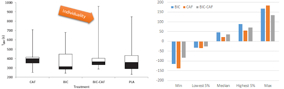 The "average" effect does yet not tell you the full truth about the potential ergogenic effects of caffeine and bicarbonate. Why? Higgins et al. found very large inter- and intra-individual variations, when they compared the individual treatments (see