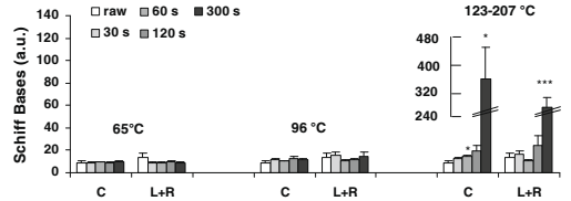 | Figure 3: Time matters, but heat, too - Markers of protein oxidation in meat exposed to 100°C (grey) and 270°C for the time in minutes indicated on the x-axes (Santé-Lhoutellier. 2008). |