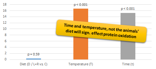 You must not forget, however, that the data in Figure 1 also shows that even the quality L+R meat is not fully protected from oxidation when it is heated at high(er) temperatures for more than 60 seconds - and that's something that is going to happen even for the most bloody (non-raw) steak. "t "and "T", i.e. time and temperature, are thus not the only, but the most significant determinants of protein oxidative modifications (cf. Figure 3).
