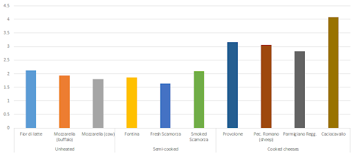 With the processing temperature, the amount of protein-bound carbonyls (PC), the previously discussed marker of protein oxidation, increases, significantly. In Figure 10 illustrates that pretty well, after all, the cheeses that were made from cooked milk all have sign. higher PC levels than those from raw or semi-cooked milk. Much in contrast to meats, the storage or, in the case of cheeses, ripening processes does not trigger a continuous increase in protein oxidation (data not shown): For Grana Padano, a cheese that's produced from cooked milk, for example, the rapid (+30%) increase in protein carbonyls in the first 1-3 months of ripening does not continue and the level of PCs remains relatively stable for the rest of the several months period spanned by the study by Fedele et al.