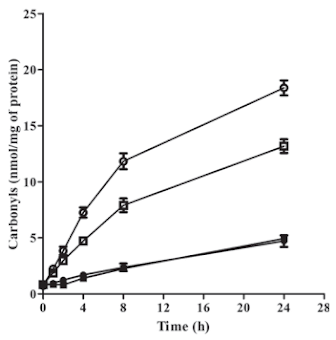 | Figure 11: Kinetics of protein carbonyl generation by UV or fluorescent photooxidation. Protein carbonyls were determined in milk exposed to UV or fluorescent (FL) light, as a function of time of exposure to radiation. ■ = whole milk (WM) exposed to FL light; ● = skim milk (SM) exposed to FL light; □ = WM exposed to UV light; and ◯ = SM exposed to UV light (Scheidegger. 2010) |