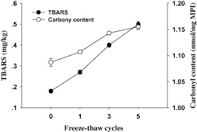 | Figure 11: Influence of freeze–thaw cycles on TBARS (fat) & carnonyl (protein oxid.) in pork (Xia. 2009) |