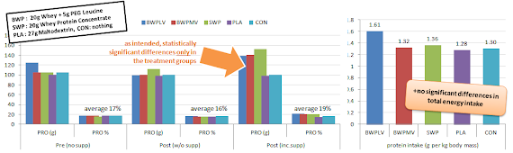 A brief glance at the data in figure 1 shows that (a) the protocol did work out as it is supposed to be and only the guys in the protein supplement groups did actually exhibit a significant increase in protein intake, and (b) that the overall protein intake on a per kg of body weight base was - quelle suprise (!) - exactly where the many ofthe latest reviews say it has to be, in order to support optimal protein synthesis in young men: in the +1.2g range (e.g. Coleman. 2012).