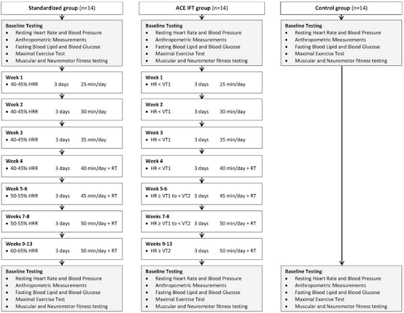 - the resistance training program for the ACE group was designed according to the ACE guidelines (Bryant. 2014) and consisted of multijoint/multiplanar exercises with both free weights and machines (still allowing for free motion during the exercise). The following exercises were performed: stability ball circuit (hip bridge, crunch, Russian twist, plank), lunge matrix, kneeling/standing wood chops, kneeling/standing hay bailers, dumbbell squats, one-arm cable row (standing), step-ups w/ dumbbells (onto 15 cm step), pull-ups (assisted), dumbbell bench press. For each exercise two sets of 12 reps were completed with the resistance progressing by 5% of the 5-RM every two weeks from 50% in week 1 to 80% in the last week (for the circuit and other exercises where you couldn't change the resistance the same progression model was adapted to the volume).