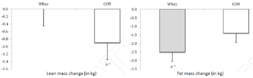 As you'd expect in a well-designed study, there were no differences in body mass change between the WHEY and CON groups. Over the course of the study, this, and more importantly, the subjects' body composition changed: While both groups lost body mass (p<.05), the WHEY group maintained their lean mass (LBM) while the CON group lost (p<.05) lean mass, and the WHEY group lost FM (p>.05) and the CON group did not, though the change in FM between groups was not different.