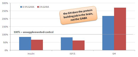 GABA exerts indirect "anabolic" effects on the brain(Thanapreedawat. 2013) -- In yet another advanced publication that happens to overlap with the sudden re-appearance of GABA supplementation within the health and fitness community, Thanapreedawat and colleagues report that the administration of gamma-amino-butyric in the drinking water (0.5% and 1.0%) of young rats lead to highly significant activation of the intra-cerebral mTOR pathway, a subsequent dose-dependent increase in S6K1 phosphorylation and corresponding increases in brain protein synthesis.