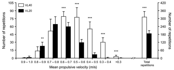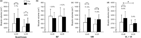 Subjects were required not to engage in any other type of strenuous physical activity, exercise training, or sports competition for the duration of the present investigation. Both VL20 and VL40 groups were assessed on two occasions: 48 h before (Pre) and 72 h after (Post) the 8-week training intervention. Training compliance was 100% of all sessions for the subjects that completed the intervention."Following the training intervention, statistically significant increases were observed in 1RM strength (18.0% and 13.4%), AV (12.5% and 6.0%), and AV<1 (21.7% and 13.7%) for VL20 and VL40 groups, respectively" (Pareja-Blanco 2017).Similarly, the quadriceps femoris volume (Fig. 3a) was increased by 6.0% (time effect P < 0.05). This was explained by a significant increase of VM volume (Fig. 3c) in both groups. In contrast to the scientists hypothesis, however, there was a small, but measurable benefit from doing more reps and going closer to failure for the sum of vastus lateralis (VL) + vastus intermedius (VI) gains, which increased exclusively in the VL40 group (group x time interaction, P = 0.05).
