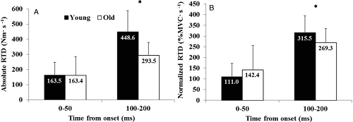 | Figure 3: Absolute (A) and normalized (B) RTD for 0–50 and 100–200 ms for the young and older men during rapid plantarflexion isometric contractions. *P <= 0.05, significant difference between the young and the older men. Data are presented as mean ± SD (Gerstner 2017). |