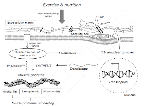 This remodeling requires the recruitment of muscle stem cells (aka satellite cells) and has hitherto often been thought of being independent of the classic hypertrophy via increases in net protein balance. Burd and De Lisio do now suggest that "muscle stem cells and protein turnover are interconnected and thus collaborate to improve rates of muscle remodeling in response to anabolic stimuli to ultimately facilitate muscle adaptations" (Burd 2017). Only if both processes are activated by training and nutrition, you will see maximal gains.