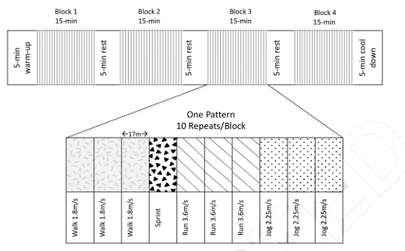 "Briefly, the test involved four 15-min blocks in which a 17-m variable-intensity shuttle pattern was repeated 10 times with 5-min rests between each block. The entire test was 75 min in length, which also included a 5-min warm-up and cool-down at a self-selected pace. The running pace in our study was based on the percentage of average maximum speed obtained by the entire group of participants during the aerobic assessment (3.45m/s) instead of the percentage of individual VO2max. In this way, the same audio prompt was used for all participants with the following 17-m shuttle paces: 1.7m/s (walk), 2.1m/s (jog) 3.1m/s (run), and an all-out sprint. The average energy expenditure during the LIST was 8.7 ± 0.2 kcal/kg (range 8.5-9.1kcal/kg, determined from accelerometer)" (Wooding 2017).Following exercise, participants consumed their first of eight hourly mixed meals containing the test protein intake (0.2-2.66 g/kg/d) and sufficient energy and CHO content in the form of test beverages containing crystalline amino acids, protein-free powder, fruit flavoring powder, grapeseed oil, and maltodextrin as well as protein-free cookies. The actual measurement was done by including a priming dose of NaH13CO2 (0.176 mg/kg) and L-[1-13C]phenylalanine (1.86 mg/kg) in every hourly meal beginning at meal #5. The turnover of this tracer was determined from urinary [13C]phenylalanine enrichment.
