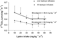 As Elango et al. explain in their 2012 paper, "the IAAO technique is based on the concept that when one indispensable amino acid (IDAA) is deficient for protein synthesis, then all other amino acids including the indicator amino acid (another IDAA, usually L-[1-13C]phenylalanine) are in excess and are therefore oxidized" (Elango 2012). That's logical, after all, dietary protein can only either be stored or oxidized. If a rate limiting amino acid is missing, storage is not an option and oxidation will take place. As the intake of said limiting amino acid increases, the oxidation of the indicator amino acid will decrease - a decrease that reflects the increasing incorporation of amino acids into protein. Yet, once the requirement is met for the limiting amino acid, there will be no further change in the oxidation of the indicator amino acid with increasing intake of the test amino acid (see breaking point in the figure). The inflection point where the oxidation of the indicator amino acid stops decreasing and reaches a plateau is referred to as the ‘breakpoint’. The breakpoint, identified with the use of two-phase linear regression analysis, will then "indicate the estimated average requirement (EAR) of the limiting (test) amino acid" (Elango 2012) - in the example from Kriengsinyos et al. (2002), the breakpoint for lysine is 36mg/kg/d.