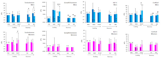 Imagine the guys simply lifted way more weight in the strength first, endurance second trial - wouldn't an increased GH response to an identical endurance workout with way more depleted glycogen stores actually be what you would have to expect? Also, we all know that when you put men and women together in the gym, the former train until they drop, while the latter do as they are told and take their time looking at the sweaty guys while fumbling around with the weights... ok, that's a cliché, but there is way more than just the splinter of truth that's at the bottom of every of these commonly held prejudices.