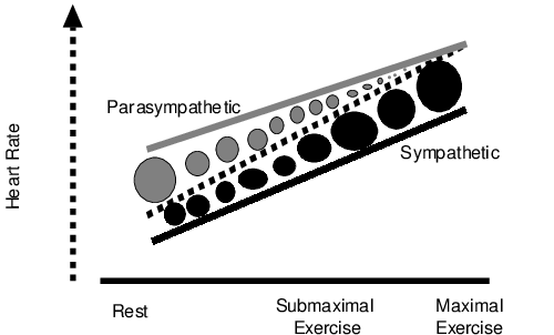 | Figure 1: Heart rate autonomic control at rest and at exercise. Parasympathetic role decreases when the intensity of exercise is increased, and the opposite happens with the sympathetic role (Almeida 2008). |