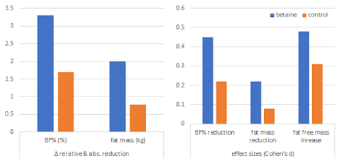 What is worth mentioning is that both treatment significantly reduced total body mass and body fat mass while increasing fat-free mass and muscle size. However, the betaine group had a significant edge in three out of four of these variables: The subjects in the betaine group lost an extra 1.6% body fat (-3.3+1.9%) compared to the placebo (1.7+1.6%) group, the saw greater reductions in total body fat and more pronounced increases in fat-free mass (45.4+6.1 vs. 47.9+5.9 kg), with the effect sizes for BF% (-.45 vs. -.22), FM (-.22 vs. -.08), and FFM (.48 vs. .31) telling you that only the betaine group scratched the value of d=0.5 that would signify a medium effect size.![]()