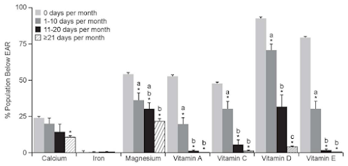 As the data in Figure 6 tells you, these vitamin shortages that occur even in people who take MVMS, but fail to take them regularly, are not restricted to the usual suspects like vitamin D and magnesium, but include vitamins, such as vitamin E or vitamin A, which are often overlooked (esp. in the health and fitness community) when we're talking about not meeting the Estimated Average Requirement (EAR)... in all that, we shouldn't forget, though, that the EARs must still be considered very rough estimates - or educated guesses if you will.