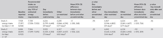 | Table 1: Energy intake at baseline and on the different unrestricted days of intermittent energy restriction in Study 1 (n = 44) and Study 2 (n = 67) in (kJ/day | Harvey 2018) |