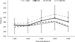 | Figure 5: Mean (±SD) kilometer split times during the 5-km time trial James et al. used as their subjects in a recent study investigating the effect of heat acclimatization (HA) and pre-cooling (PC) individually and in conjunction (James 2018). |