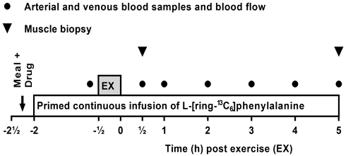"[...e]ach trial was preceded by a four‐day lead‐in treatment period. Leg protein turnover rates were assessed by infusion of [13C6]‐phenylalanine and sampling of arterial and venous blood as well as vastus lateralis muscle biopsies 0.5 and 5 h after exercise.