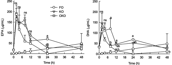 Eat Your Fish Oil and Digest it, Too (Unoxidized!) | DHA:EPA Ratio of 1:1 = Min. Oxidation, Max. Uptake | more - Long-term study: Rats were divided in the same manner as for the short-term test. Saline, FO, KO, and CKO (500 mg) were orally administered every day to each rat for 2 weeks. After 2 weeks, rats sacrificed, and blood and brains were collected.