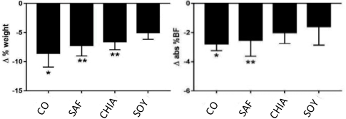 | Figure 3: Relative changes (%) in body weight (left) and body fat (right) over the course of the 8-week study by Oliveira-de-Lira et al. according to type of fatty acid suppl.; * p<0.05 vs. CHIA & SOY; ** p<0.05 for SOY. |