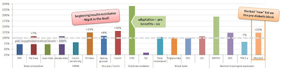 "Before and after the intervention, body composition, respiratory exchange ratio (RER), insulin sensitivity, muscle metabolic gene and protein expression were assessed. Adaptive responses to hyperglycaemia (7 days, 15 mM) were tested in primary human myotubes." (Sartor. 2013)I guess few of you will be surprised by what they are just about to see in the selected data I plotted for you in figure 1. And if you are honest, what we are seeing here is - at least in parts - actually an adaptive response.