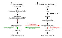 Theoretically glutamine could be a potential candidate, as it has the ability to block the MondoA induced, glucose dependent activation of the thioredoxin-interacting proteinin and the subsequent blockade of glucose uptake. And while respective research on this mechanism is not yet available, those of you who have been around ever since the early beginnings of the SuppVersit, may remember the 2010 post on the "Positive Effect of L-Glutamine on Insulin Sensitivity" (read more) - who knows, maybe it is mediated by the blockade of the transcriptional activity of MondoA at the TXNIP promoter (see figure on the right)!?