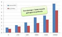 - significantly reduced glycogen synthase after eccentric vs. concentric training in ten moderately trained subjects after 10 sets of 10 repetitions of either concentric or eccentric contractions in opposite legs and the ingestion of 0.4g carbohydrate/kg body wt every 15min (Doyle. 1993; see figure 3).