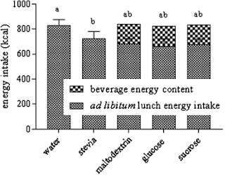 For said study, the authors tested in a randomised controlled double-blind crossover trial, how the energy intake of healthy participants (n = 20, 9 males, mean body mass index 21.8 kg/m²) was affected by having different beverages 30 minutes before an ad-libitum (have as much as you want) lunch condition. The test beverages included (C) 330 mL of water (control-no calories and no taste) and either 330 mL of water containing (1) 40 g glucose or (2) sucrose (sweet taste and calories), (3) maltodextrin (calories and no sweet taste), or (4) 240 ppm all-natural sweetener, stevia (Truvia RA-95-sweet taste and no calories).