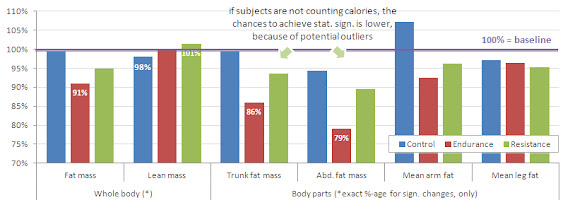 The participants, whose body composition was measured by the means of dual-energy X-ray absorptiometry (DXA) were all healthy and physically active and with an average BMI ~22kg/m² and body fat levels of ~17% at a level comparable to that of the average gymrat striving "to [eventually?] look good naked" ;-) According to the research design, all participants were required to keep their dietary habits unchanged during the 10-week study period.