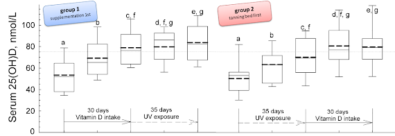 "Two weekly whole body UV exposures to a total dose of 4.8 SED for 5 weeks to a total dose of 23.8 SED are equal to 2000 IU/d of oral vitamin D supplementation for 30 days and enough to achieve and maintain serum 25(OH)D concentrations above 75 nmol/L in ~ 55% of the cases." (Lagunova. 2013).In the end, it does therefore not appear to matter, whether you take the natural or supplemental approach to keep your vitamin D levels in the upper tertile of the (revised) normal range - personally I would yet prefer the ultra-natural route (at least for the summer months).