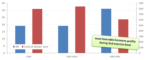 - Carbohydrate + protein drinks maximizes GH response to exercise -- Now that you know that it's not worth to guzzle on carbohydrate + electrolyte + protein drinks during a workout for hydration purposes, I guess I should tell you that doing the same (w/out the electrolytes, though), may still provide an athletic / anabolic edge. After all, another recently published study that was conducted at the School of Sport at the Department of Exercise and Health Sciences of the Loughborough University in Leicestershire, U.K (Betts. 2013) shows that the ingestion of a carbohydrate + protein mixture (CHO+PRO: 0.8 g sucrose per kg bod weight per hour + 0.3 g/kg/h whey protein isolate) in the 4h recovery period between two exhaustive treadmill runs at the same intensity augmented the growth hormone response by 60%(!) compared to the ingestion carbohydrate only (0.8 or 1.1g of sucrose /kg per hour).