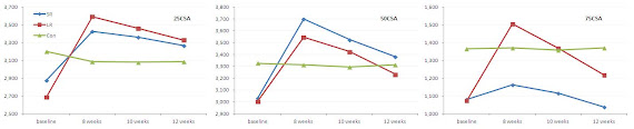 "[...] main effect of group remained during weeks 10 and 12, as SR regressed toward baseline by week 12, whereas LR still possessed significant losses at this phase (-10±6%)" (McMahon. 2013)and that there was a similar trend seen at 75% where a main effect of both group and training existed at week 8 (p<0.05) - even if the latter vanished in the course of the 4-week detraining period 7±3% SL and 9±1% LR).