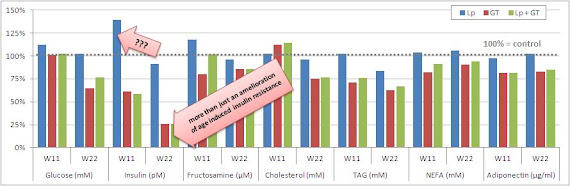 | Figure 2: Glucose insulin, fructosamine, cholesterol, triacylglycerol, non-esterified fatty acids and adiponectin levels in the blood of the mice in week 11 and week 22 of the study (Axling. 2012) |