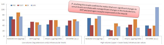 "+35% and +43% increases in AR mRNA expression 48 hours after the first and third resistance exercise bouts, with a peak increase of 68% in AR mRNA expression occurring 48 hours after the second resistance exercise bout within the resistance exercise group" (Farbriak. 2013)which was ascribed to corresponding increases in serum testosterone levels. In view of the fact that the latter were absent in Farbiak's subjects, it is not surprising that the existing increases in AR receptor mRNA in the study at hand did not reach statistical significance. Similarly, Farbiak was not able to show significant alterations in androgen receptor protein content in response to either LV or HV bouts of resistance exercise, which leaves us with pretty much of a null result and raises the question...