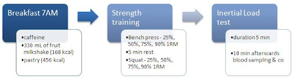 On the actual testing day some baseline measurements, such as height, body fat %, as well as blood and urine samples were taken (PRE). Afterwards the subjects consumed a standardized "breakfast" consisting of a 330 mL of fruit milkshake (168 kcal) and a pastry (456 kcal; total energy for both 624 kcal; 68 g of carbohydrates) along with the their individualized randomized caffeine dose (3, 6 or 9 mg/kg) or placebo in capsule form. After this "delicious" *lol* breakfast, the participants performed