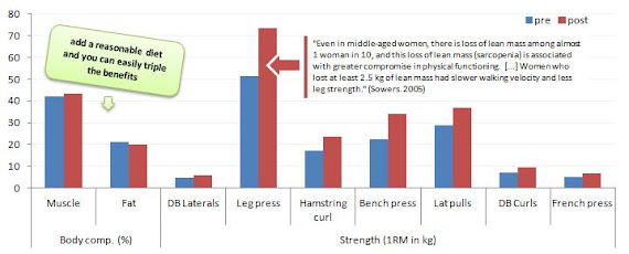 Apropos benefits: What was it about the toning effect? Well, if you take a look at the exercise program, it included neither "toning" exercises nor "cardio" training - just a 10-15 minute warm up with general and specific exercises that was followed by 3x sets of 9-10 repetitions for each of the seven strength exercises:"Focusing on hormonal variations across the menstrual cycle, changes in estradiol and progesterone excretion were observed during the follicular and luteal phases, following a similar pattern both before and after training. [...] Given that there is a high correlation between the blood and the urine steroid profile [...], a large excretion would indicate a rise in ovarian production of estradiol and progesterone during these phases. Based on these hormonal variations across the menstrual cycle, some studies have stated that muscle hypertrophy and strength gain are higher in the luteal phase than in the follicular phase Sakamaki et al. (2012)." (Timon. 2013).
