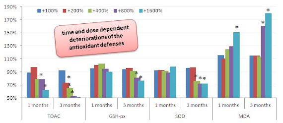 | Figure 2: Total antioxidant capacity, glutathione peroxidase, SOD, and lipid peroxidation (MDA) after 1 and 3 months expressed relative to untreated control (Xia. 2013) |