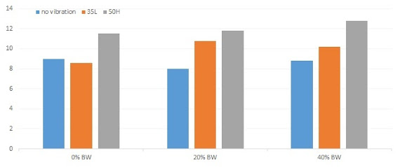 The nine training protocols represented different combinations of external load applied at shoulder level using a backpack (0%, 20%, and 40%BW) and vibratory condition (see Figure 1). Vibratory conditions ranged from no vibration (NV) to 35Hz at 2–3 mm (35L; 1.89g) and 50Hz at 5–6 mm (50H; 7.7g) (Pel. 2009). The vibratory conditions reflect the frequency–displacement relationships found to maximize neuromuscular performance in our earlier study (Adams. 2009).The equipment the scientists used was a synchronous WBV plate (Model Pro-5, Power Plate North America, Northbrook, IL).