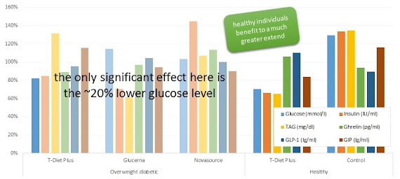 It should be mentioned, though that the control supplement for the healthy individuals was not identical to any of the two formulas that were compared to T-Diet Plus in the experiment with the diabetics. Whether the differences between T-Diet Plus and a "regular" meal replacement would be more pronounced would thus still have to be tested in diabetics.