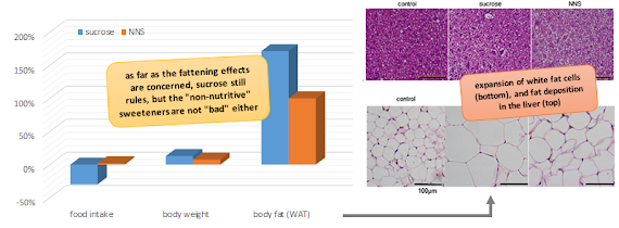 Just to make this clear: This is not the first study to show that artificial sweeteners can have obesogenic effects in rodent models. In contrast to Naismith et al. (1995) and Blundell & Hill (1986) who observed a "pradoxical effects" of artificial sweeteners on the appetite of their lab rodents, the rats in the study at hand did not overeat, though! They also moved about as much as their peers in the control group and still got fat and sick.
