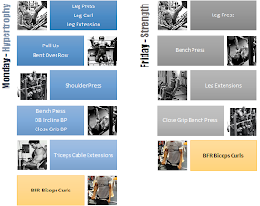 Figure 1: Exercise selection for the two training sessions; BFR indicated blood flow restriction. All subjects trained twice a week for a total of 8 weeks, 4 weeks with, 4 weeks without cuffs on the biceps exercise (Lowery. 2013)