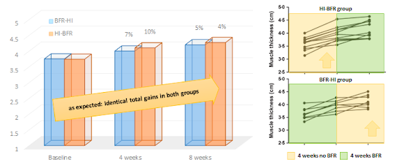 Compared to conservative protocols, a "cross over" had the advantage of (a) providing a larger subject base and (b) allowing to control intra-individual variations, i.e. answering the question "What's the best protocol for person A?". The obvious downside wass that the total study duration for BFR and regular training wasonly 4 weeks per person.