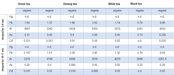 | Table 3: Levels of mercury (Hg), lead (Pb), aluminum (Al), arsenic (As) and cadmium (Cd) in tea infusions after 3-4 or 15-17 min of brewing; all values in µg/L (Schwalfenberg. 2013) |