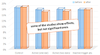 Figure 2: Effects of 9 weeks of active or sham (inactive trigger points) acupuncture on % of subjects above ideal body weight; a good example of insignificant, but positive effects (Mok. 1976) - Cabıoǧlu et al. observed decreases in serum total cholesterol, triglyceride, and LDL cholesterol levels that were mediated by increases in serum beta endorphin in response to electroacupuncture of the ear points, Sanjiao (Hungry) and Shen Men (Stomach), and the body points, LI 4, LI 11, St 25, St 36, St 44 and Liv 3, once daily, for 30 minutes, for 20 days (Cabıoǧlu. 2005).