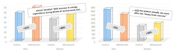 But don't worry, ladies. Life is not so unfair as it may seem. All you have to do to achieve an almost level playing field is to convince him that a 45 min walk in the park with you is much more fun than 45 min of high intensity thinking. And if that's not convincing enough, show him the data in Figure 3 and tell him that real exercise (in the study 45min of paced walking) will help both of you improve your energy balance - his by -31% (-516kcal) and yours by -23% (-184kcal).
